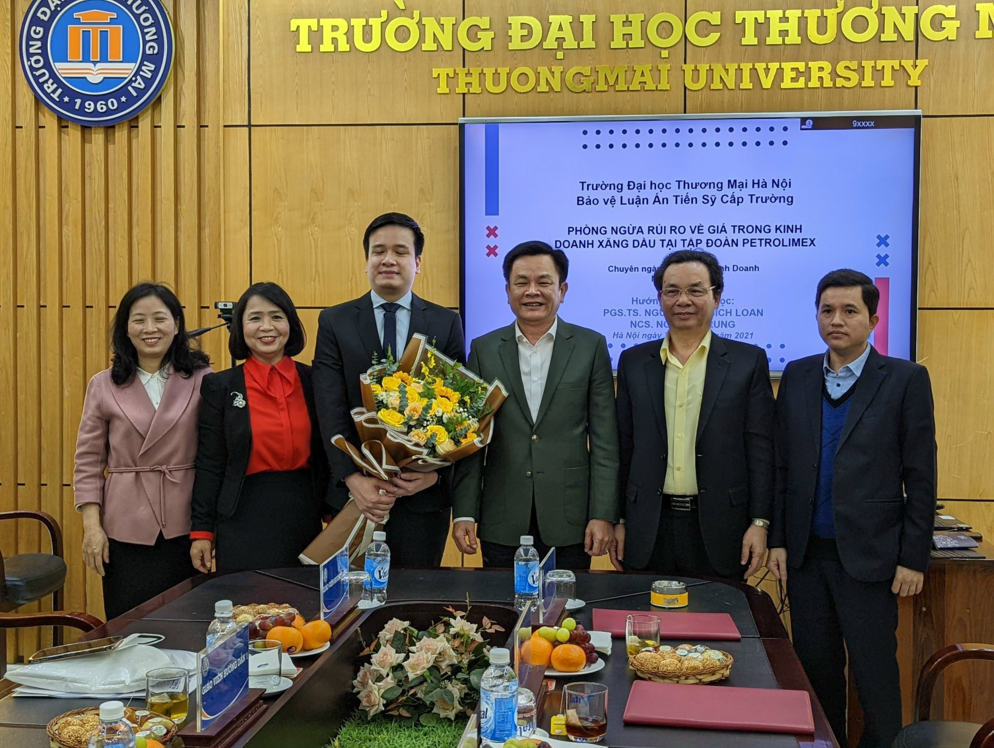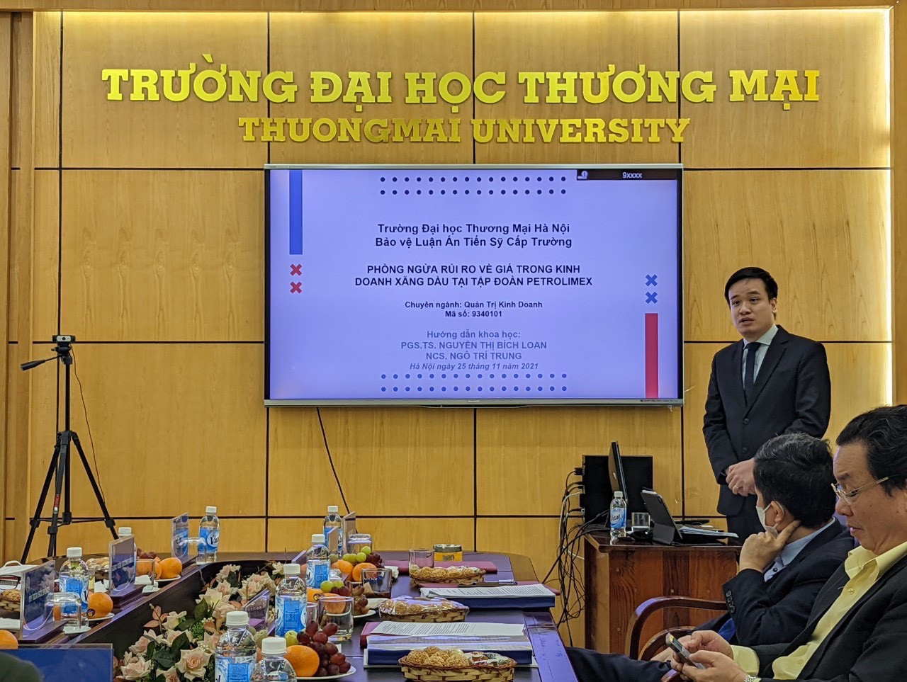 Sáng ngày 25/11/2021, Phòng Hội thảo số 2 nhà I, Trường Đại học Thương mại đã tổ chức Lễ bảo vệ luận án tiến sĩ cho nghiên cứu sinh Ngô Trí Trung, chuyên ngành Quản trị kinh doanh (mã số 934.01.01 ), đề tài luận án “Phòng ngừa rủi ro về giá trong kinh doanh xăng dầu tại Tập đoàn Petrolimex” với sự hướng dẫn khoa học của PGS.TS. Nguyễn Thị Bích Loan